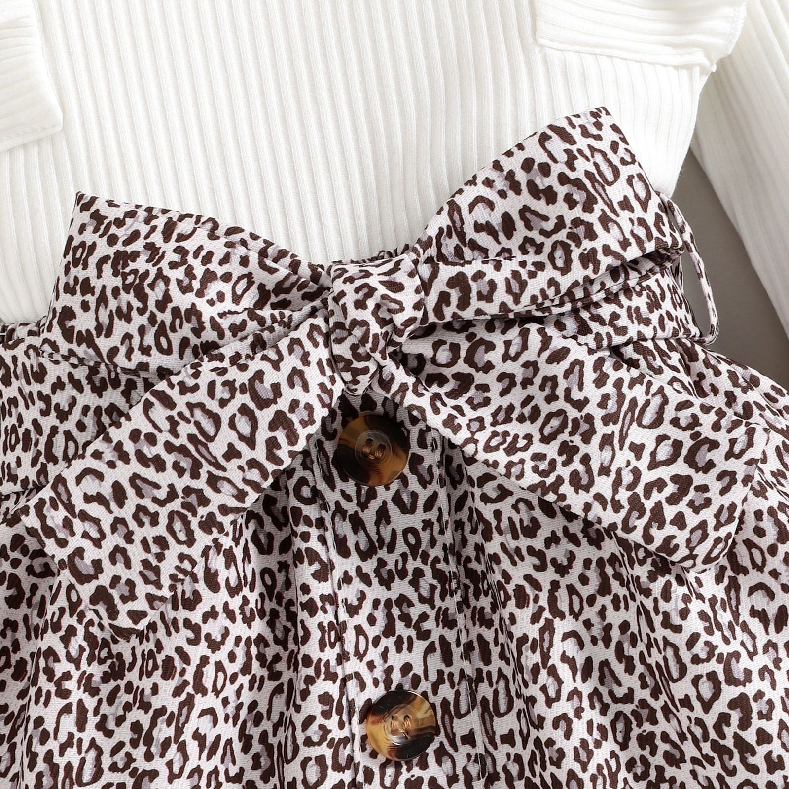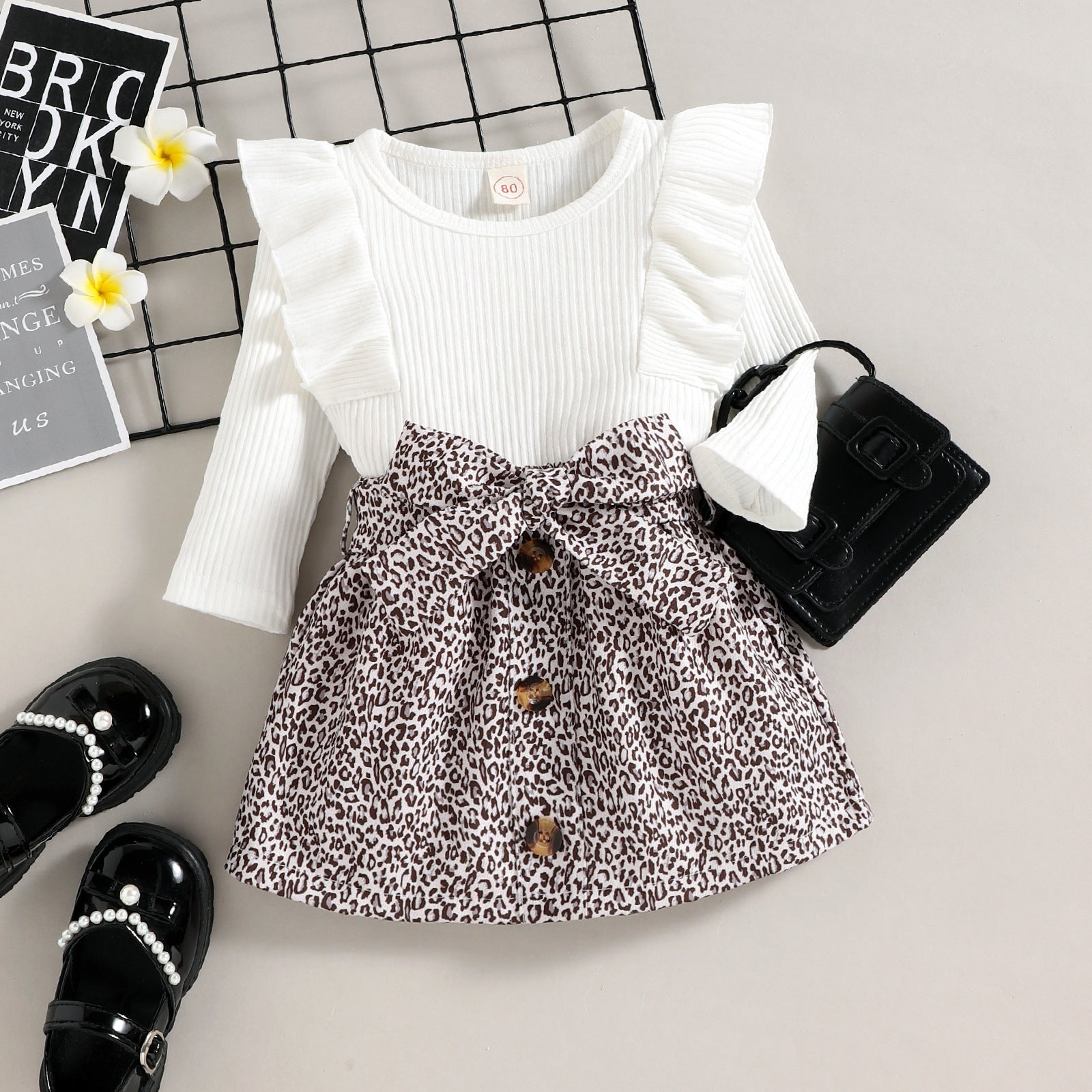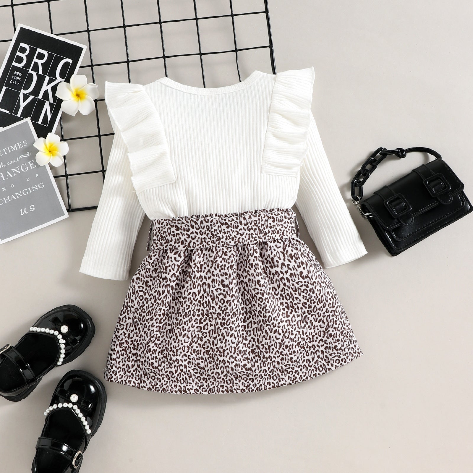 Girls' Autumn And Winter Ruffled Long Sleeve Leopard Print Short Skirt Two-piece Set Little Kids' Suit